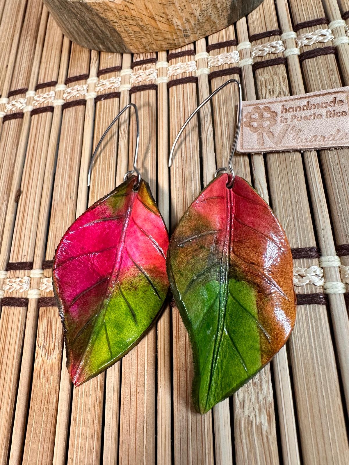 Añade un toque de color y naturaleza a tu estilo con estos aretes de hoja frutal en tonos mixtos que combinan amarillos, rosados y verdes, elaborados a mano en cuero vegetal de alta calidad. Cada pieza está teñida con tinta de forma artesanal, creando un diseño único y vibrante.