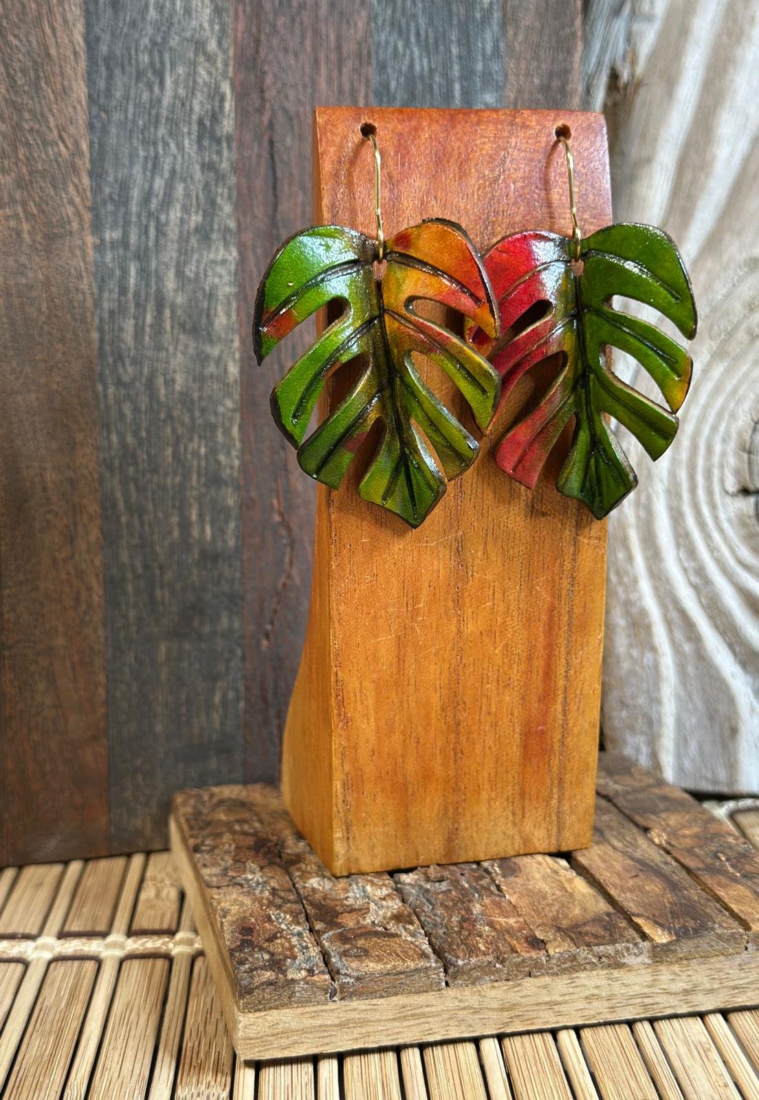 Aretes de hoja Monstera en tono verde natural con tonalidades rojas y amarillas, hechos a mano en cuero vegetal teñido con tinta y pirograbado. Gancho de acero inoxidable color dorado. Medidas: 2 ½” a 2 ¾” de largo (incluyendo el gancho), 1 ½” de ancho. Peso: 2 oz.